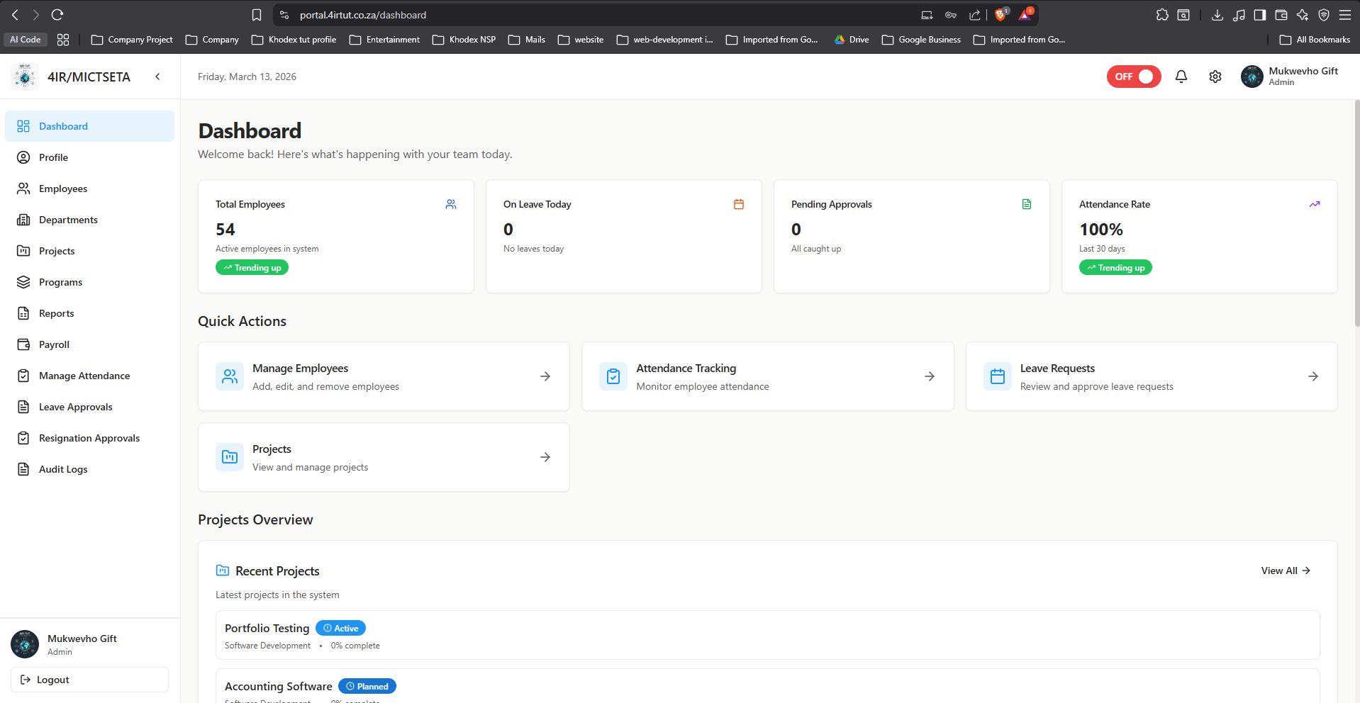 A clean admin dashboard for team operations, approvals, attendance, and project tracking.